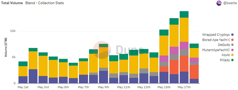 NFT市场Blur正以惊人的速度发展。随着其新借贷平台Blend的推出,Blur又迈上了一个新台阶。根据Dune的数据显示,Blend自推出仅17天以来,已促成了超过100,000 ETH的总交易量,约合1.81亿美元。
