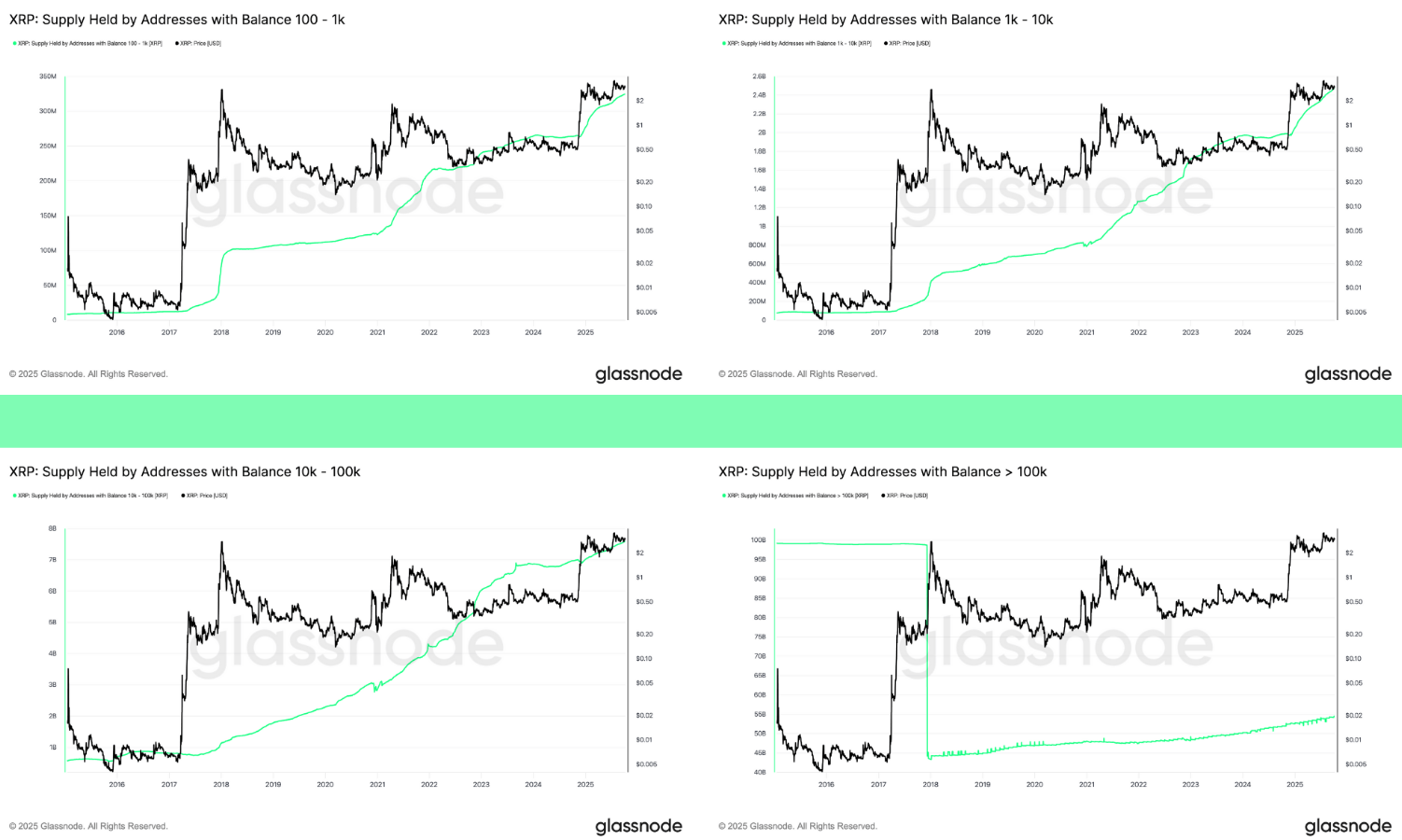 Glassnode数据显示,持有10,000至100,000 XRP的投资者持续买入。此外,XRP今年资金流入规模仅次于BTC、ETH和SOL,位列第四。ETP和信托产品中机构需求保持活跃,表明专业投资者正在介入。