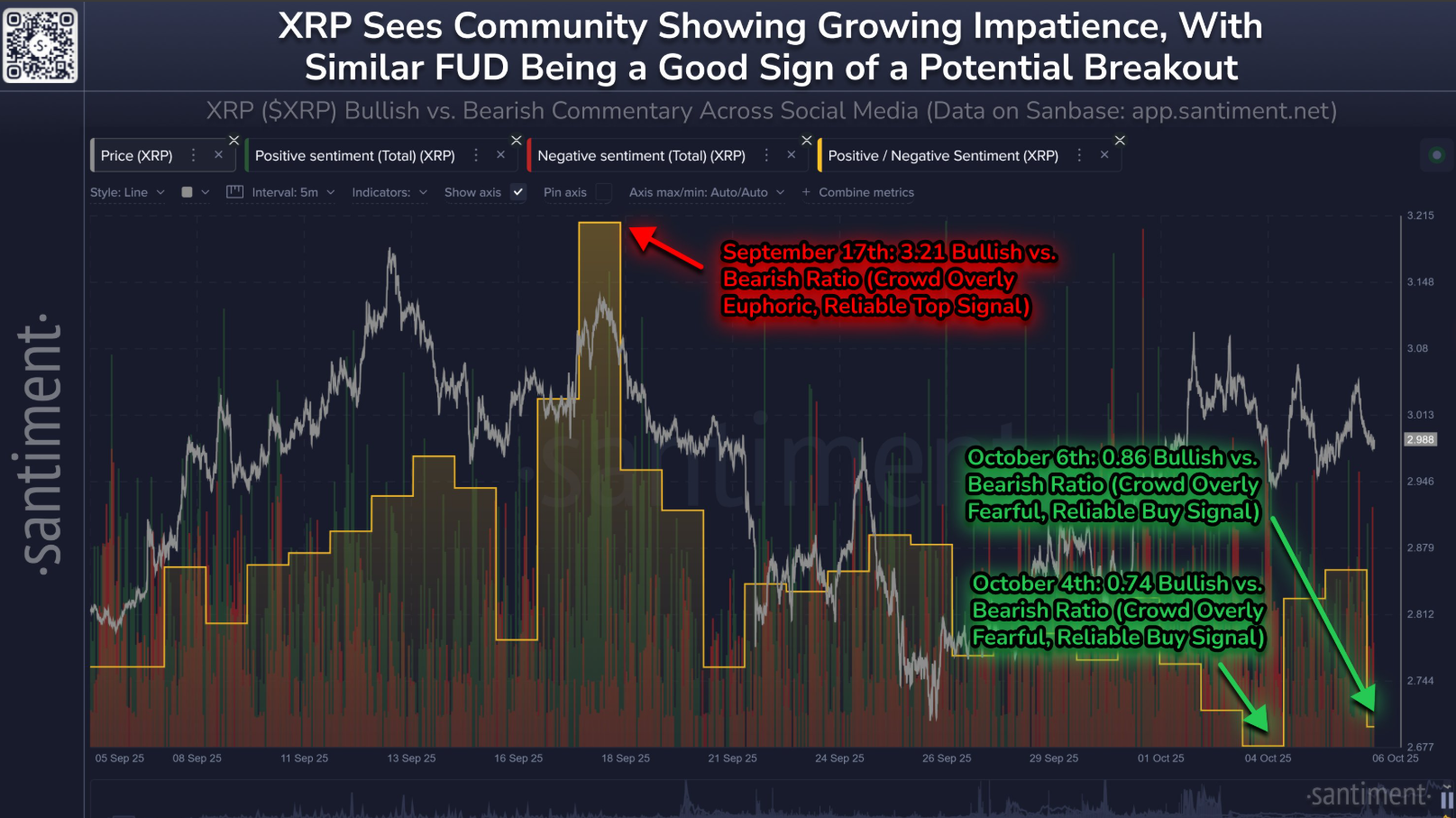 Santiment链上数据显示,XRP的多空情绪指数在两天内跌破1,标志着与四月份相当的恐惧情绪再度蔓延。与普遍认知相反,这种恐惧、不确定和怀疑(FUD)往往是反弹前兆。四月份25%的下跌之后出现了125%的暴涨,正是这种趋势的典型案例。