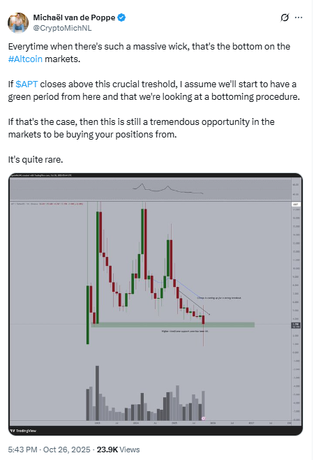 在剧烈波动的山寨币市场中,没有比超长下影线更清晰的"抄底"信号。高速公链项目Aptos(APT)日内下探3.28美元后强势反弹,最终收于3.56美元,形成涨幅7.84%的阳线。知名分析师Michaël van de Poppe在社交平台精准研判:"每当出现这种巨型下影线,往往标志着#山寨币市场阶段性底部。"