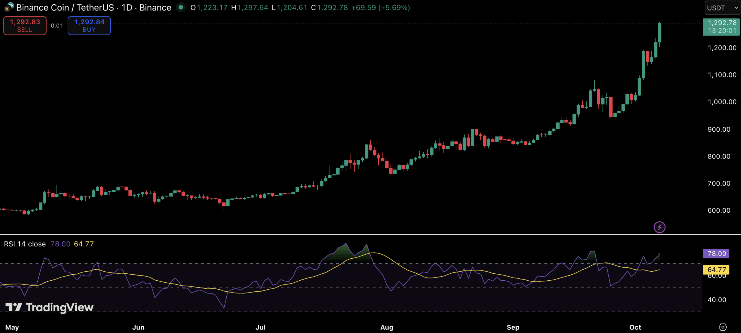 截至发稿时,BNB交易价格为1,291.95美元,过去24小时上涨近6%,周涨幅超28%。其市值攀升至约1,798亿美元,以微弱优势超越XRP的1,783亿美元。这一转变凸显出投资者对币安生态系统日益增长的信心,以及该代币在去中心化金融和交易所业务中不断扩展的实用性。