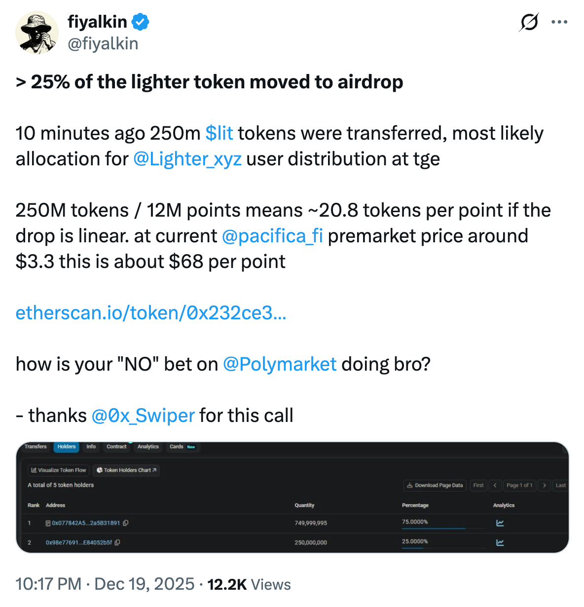 上周五Lighter转移了2.5亿枚LIT代币(占总供应量的25%),引发社区推测这预示着在12月31日预期的代币生成事件前将进行用户空投。