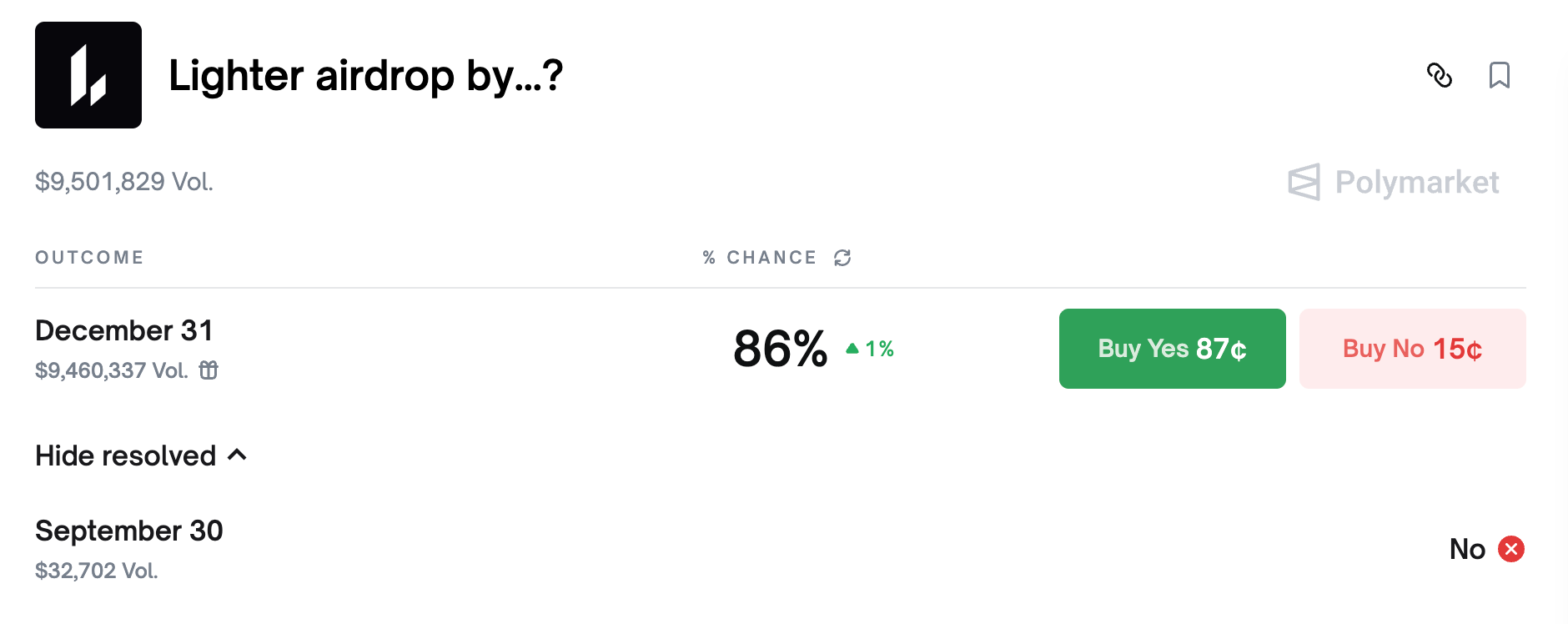 随着社区期待升温,预测市场Polymarket数据显示Lighter在年底前进行空投的概率持续攀升,目前已有950万美元押注支持12月31日前空投的预测。至少86%的交易者将赌注押在“会空投”选项上。