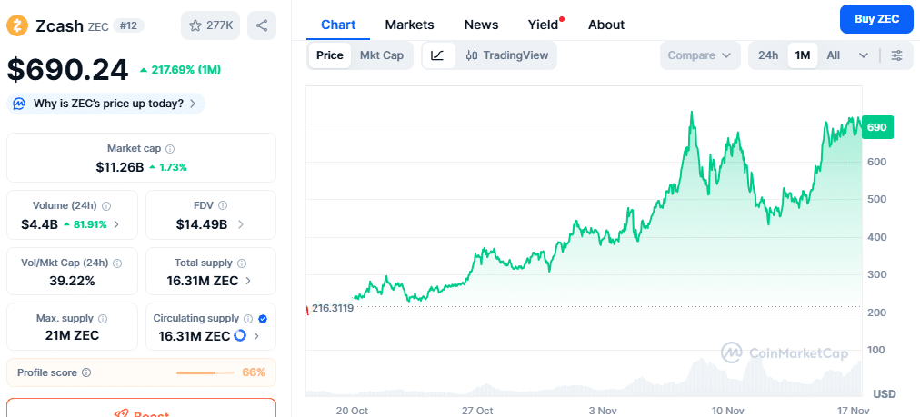 ZEC近期表现亮眼,过去一周上涨7%,过去一个月暴涨217%。这种上涨与市场对隐私资产的重新关注及鲸鱼增持有关。历史数据显示,在市场不确定性时期,这类代币往往成为短期对冲工具。