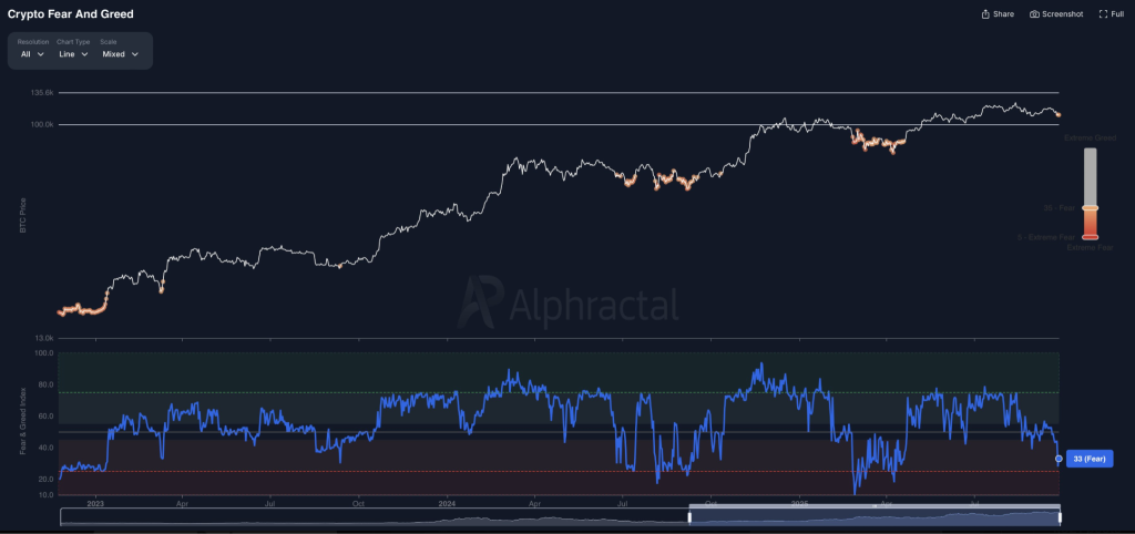 比特币当前交易价格为109,441美元,随着市场情绪接近极端水平,显示出潜在反转迹象。加密货币恐惧与贪婪指数显示为33,正在接近关键的25分界线——该水平在过去往往对应局部底部形成。