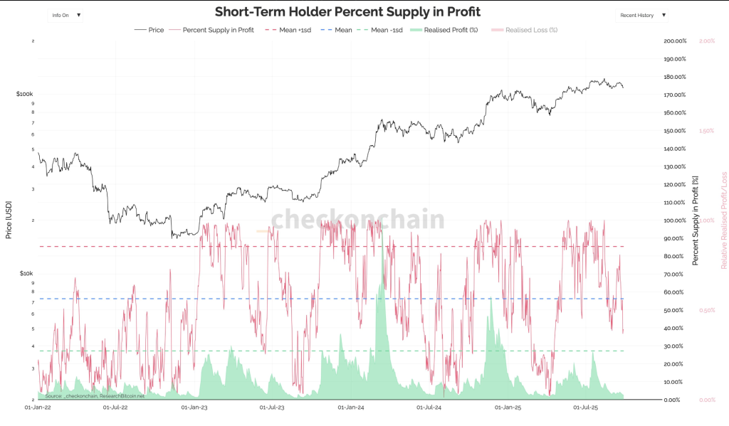 短期持有者仍有36%的持币处于盈利状态,但分析师预计进一步下跌将迫使其抛售。历史数据显示,当短期持有者盈利比例被压缩至5%以下时,往往伴随强力吸筹区域的形成。