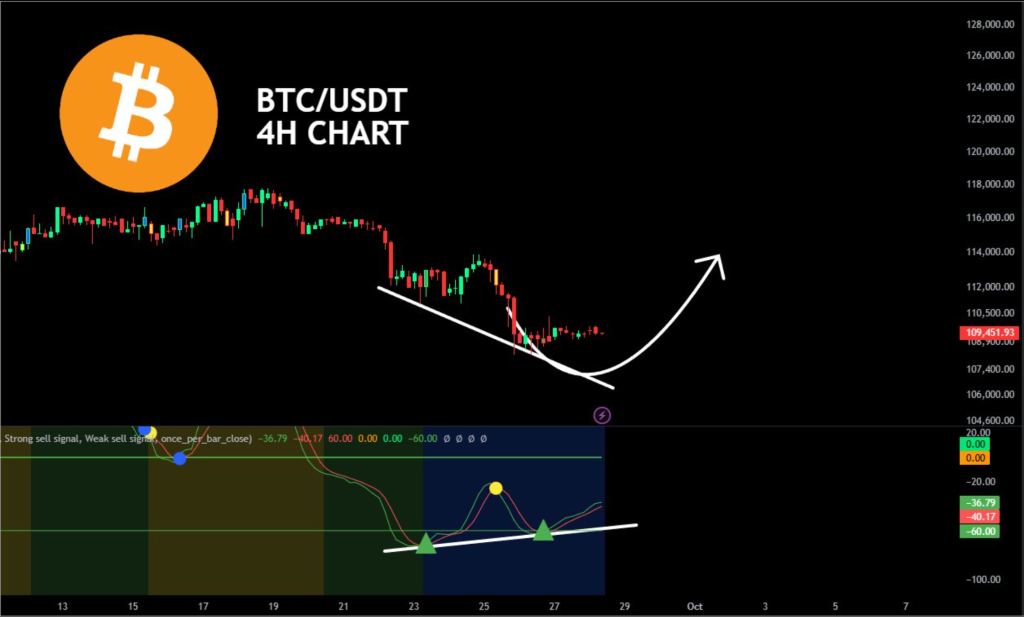 当动量指标从-60回升至-36.79时,背离形态显现,同时价格维持在关键下降支撑趋势线上方。若动能持续改善,价格可能测试112,000至114,000美元阻力区域。