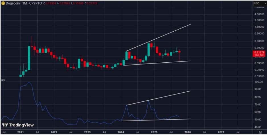 自2022年以来,DOGE始终在0.21-0.22美元间呈现上升楔形走势。主要支撑位在0.10-0.15美元区间,阻力位则位于0.30-0.35美元和0.50美元。分析师认为决定性突破这些关口可能引发新一轮上涨。