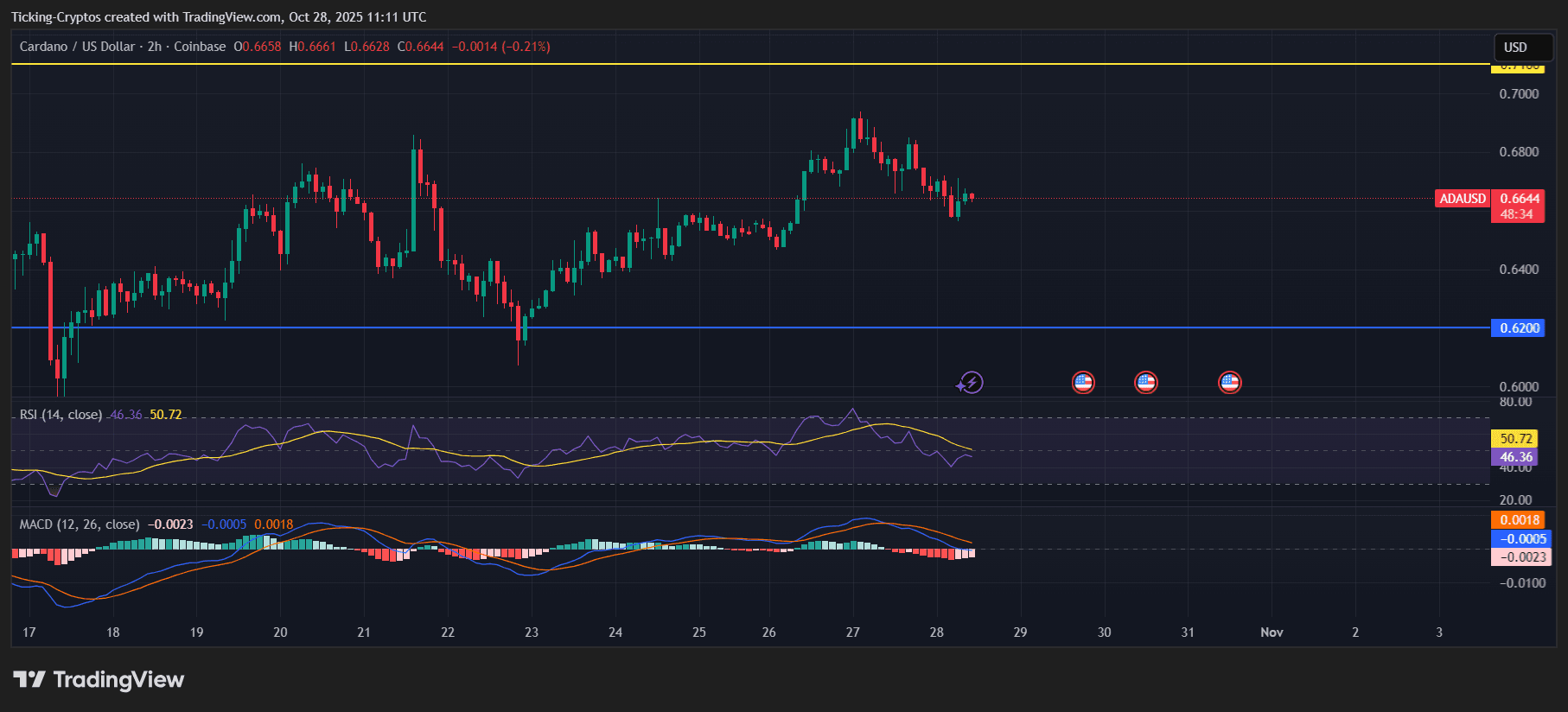 截至发稿,ADA交投于0.66美元附近,正试图从上周高点回落后企稳。图表显示温和回升结构,但在交易者等待动能确认之际,整体趋势仍不明朗。