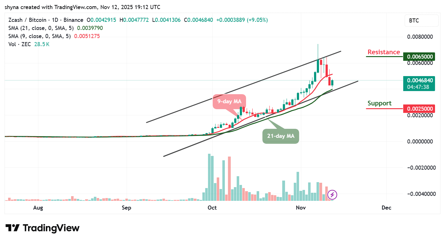 ZEC/BTC货币对虽经历局部高点回调,仍保持看涨态势。当前4684聪的报价受到9日与21日均线的双重支撑,这两条持续上扬的均线明确传递市场积极情绪。图表显示ZEC在上升通道内运行,短暂回撤后从通道下轨反弹,表明买盘正在捍卫结构并尝试恢复涨势。若动能增强,该货币对可能再次挑战6500聪阻力区。