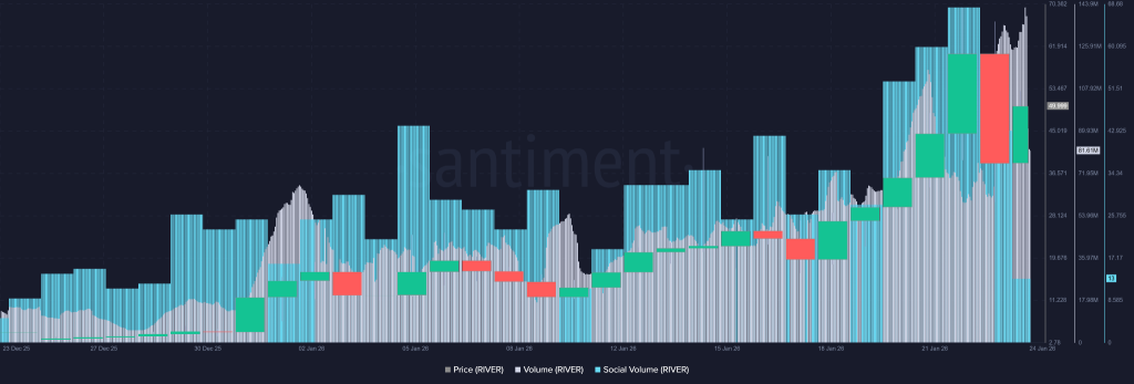 从技术层面观察,RIVER价格图表呈现出中型资产中最强劲的月度扩张态势之一。在20日与50日指数移动平均线形成黄金交叉后,价格从约7美元飙升至近72美元,最高涨幅超过900%。虽后续价格回调至49.72美元附近,但RIVER月度涨幅仍接近600%。