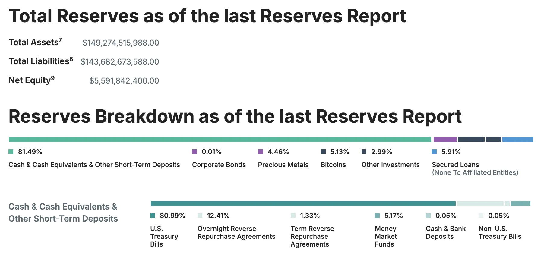 核心矛盾在于:Tether持有80亿美元黄金储备,却发行了1590亿流通USDT。虽然公司盈利能力强且资产雄厚(2025年Q1报告显示其超额准备金达