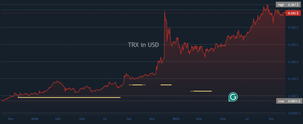 波场的原生代币TRX长期表现优异,并在2024年至2025年间持续获得市场支撑。该资产从最低0.0815美元上涨至最高0.367美元,展现了其强劲势头。尽管期间出现短暂回调,但图表显示其呈现积极的上升趋势,这得益于坚实的基础和网络扩展。
