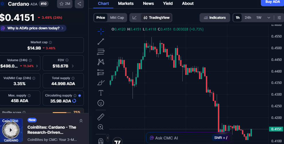 卡尔达诺近期价格持续下行,市值同步收缩。当前ADA总市值较前下跌3.48%,24小时交易量缩减11.34%至4.98亿美元。交易活跃度下降虽反映短期投资者兴趣减弱,但也预示市场企稳后可能酝酿更大行情。