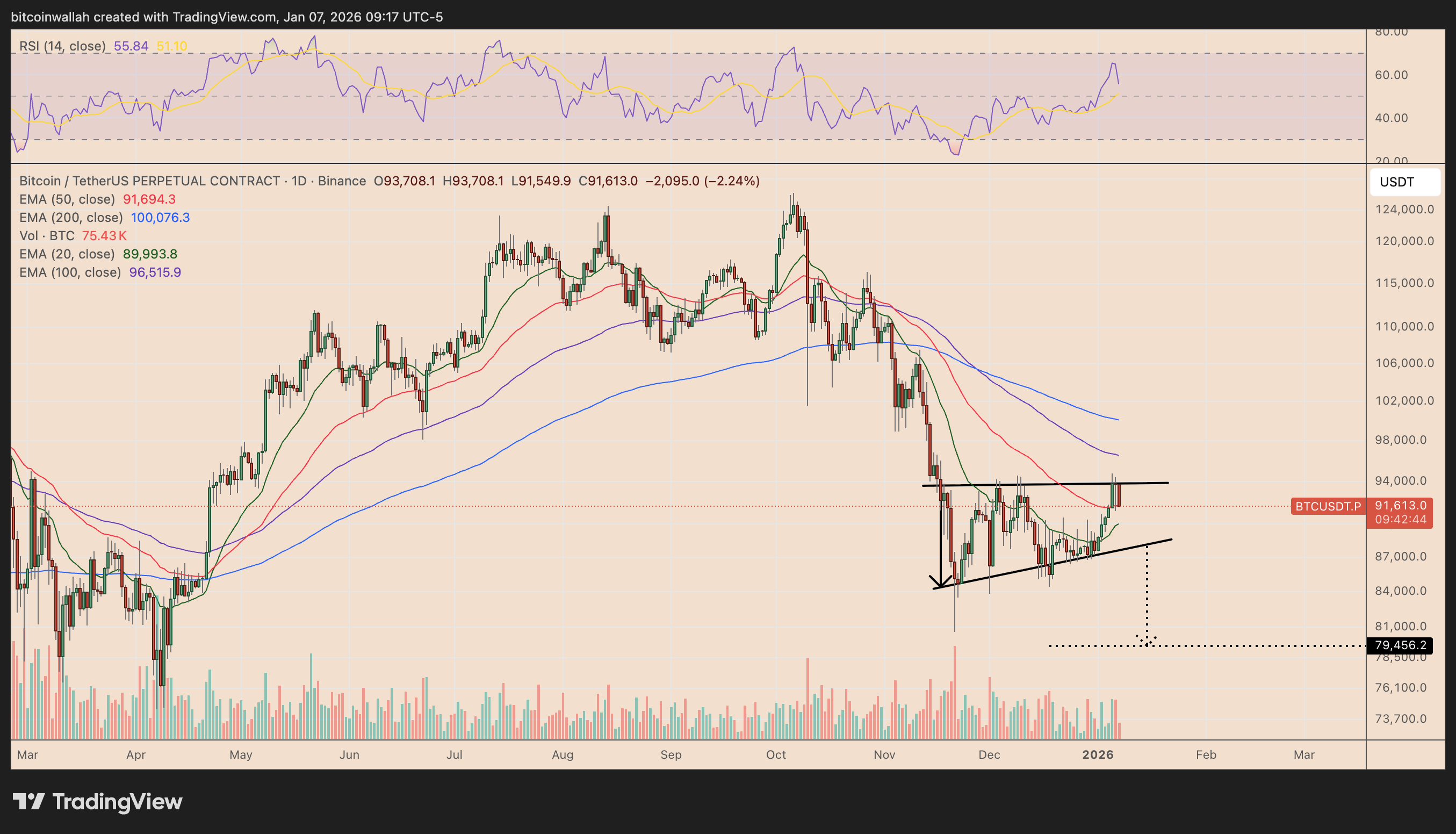 若未能维持该支撑位上方动能,价格可能向下测试1月形成的88,000-89,000美元区间,该区域与20日指数移动平均线及三角形下轨趋势线重合。若进一步跌破三角形下边界,下跌趋势可能延伸至79,450美元目标位,该目标依据潜在破位点88,300美元减去三角形最大高度测算得出。