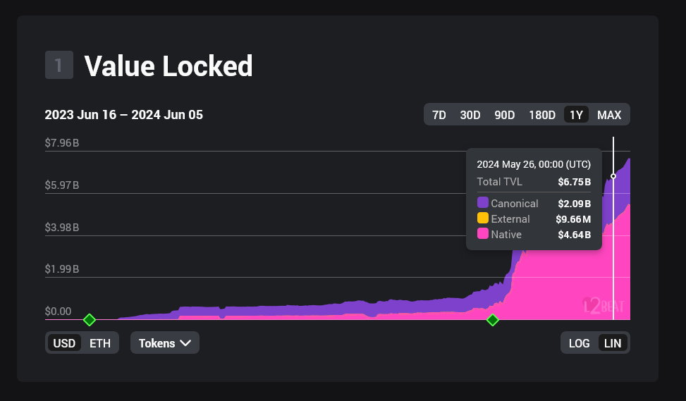 Blast是由NFT市场Blur的创建者推出的新兴Layer 2网络,凭借其独特的ETH和稳定币原生收益而获得认可。Blast在Layer 2利润中的份额从4月的5.3%增加到5月的15.2%,显示了其在生态系统中的日益增长的影响力。