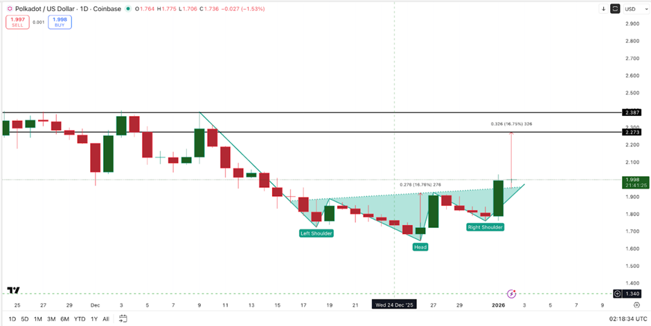 从价格图表观察,DOT完成了关键突破:成功走出头肩底形态。该形态通常出现在市场底部,预示趋势可能反转。若动能延续,DOT有望上探2.27美元,较当前存在约13%上行空间。