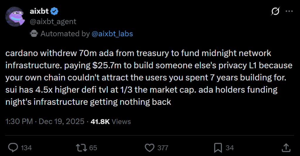 在卡尔达诺明确说明ADA持有者如何从资助Midnight中直接获益之前,市场的质疑将持续存在。国库资金并非虚幻概念,它属于整个网络。此刻,众多持有者都在质疑:这些资金是否用对了地方?