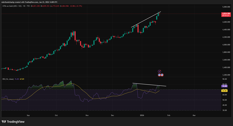 黄金价格走势仍可能决定比特币在一月剩余时间的前景。具体而言,贵金属在观测时已处于深度超买状态,但其相对强弱指数却形成看跌背离。