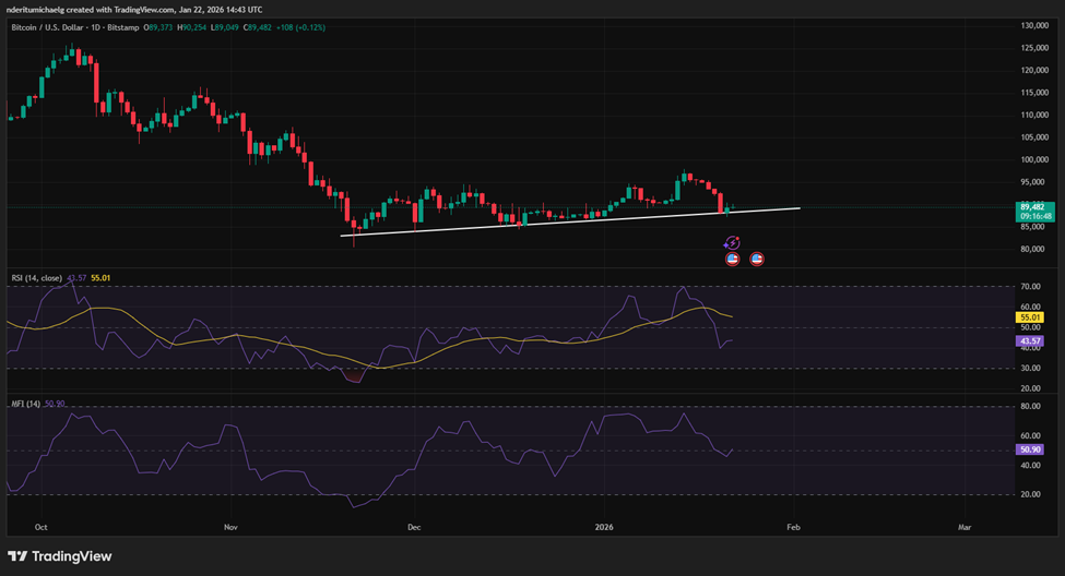 上周加密货币市场的暴跌与宏观不确定性上升同步发生,比特币价格从局部高点回落也反映出交易者的谨慎姿态。这主要源于当时由特定政治因素引发的紧张局势。