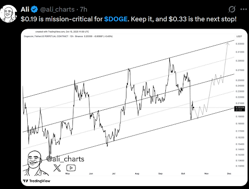 分析师指出,Thumzup等企业利好消息缺乏实质跟进,叠加模因资产资金流入减少及流动性紧缩,共同导致弱势行情。技术面显示,交易者正密切关注0.19美元关键支撑位。知名分析师Ali Martinez强调"0.19美元对DOGE至关重要",守住该位置可能为未来几周上探0.33美元打开通道。