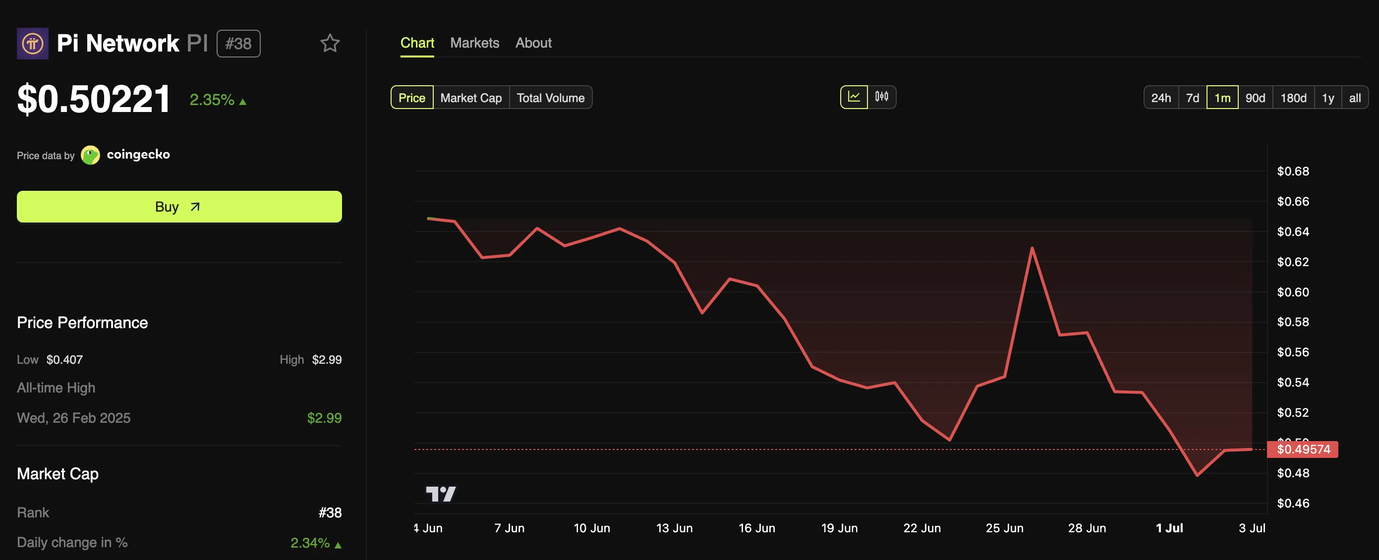 在生态扩张背景下,Pi Coin在经历过去一个月22%的跌幅后出现温和反弹。最新数据显示,该代币正逐渐远离历史低点。截至发稿时,这款手机挖矿加密货币的交易价格为0.50美元。
