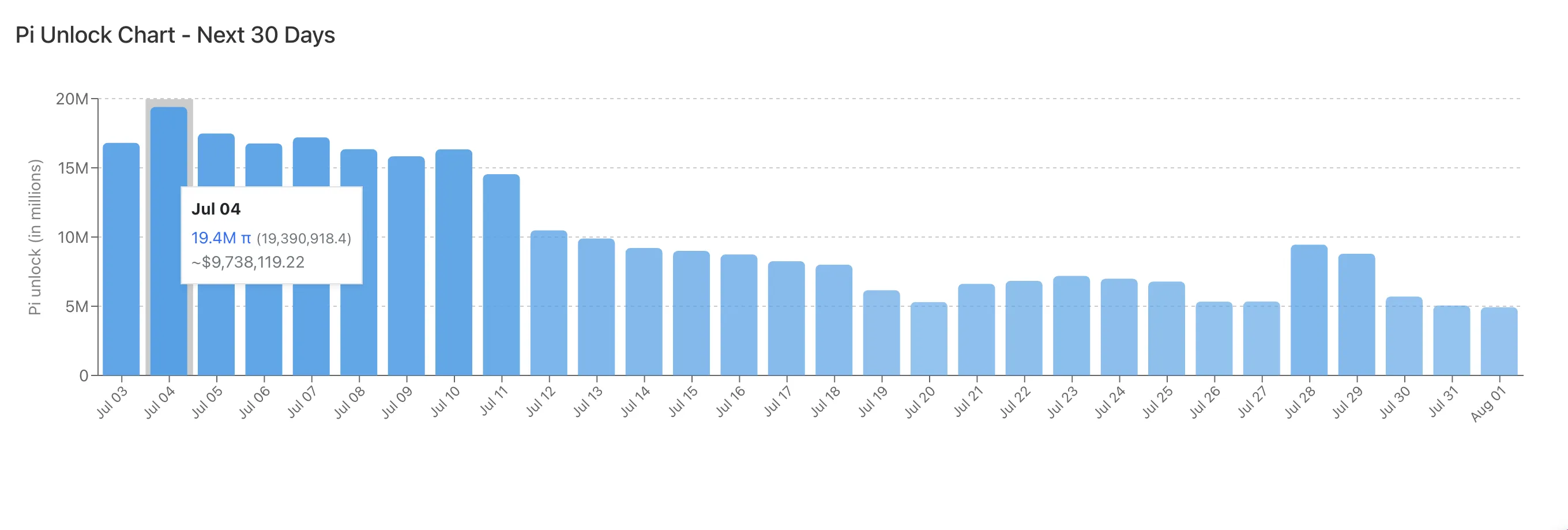 然而即将到来的大规模代币解锁可能抑制价格上涨。据PiScan数据,团队将在未来30天释放超3亿枚PI代币,价值约1.53亿美元。值得注意的是,1940万枚代币——本次解锁周期内单日最大量——将于7月4日释放。这种流动性涌入可能加剧抛压,逆转近期涨势。