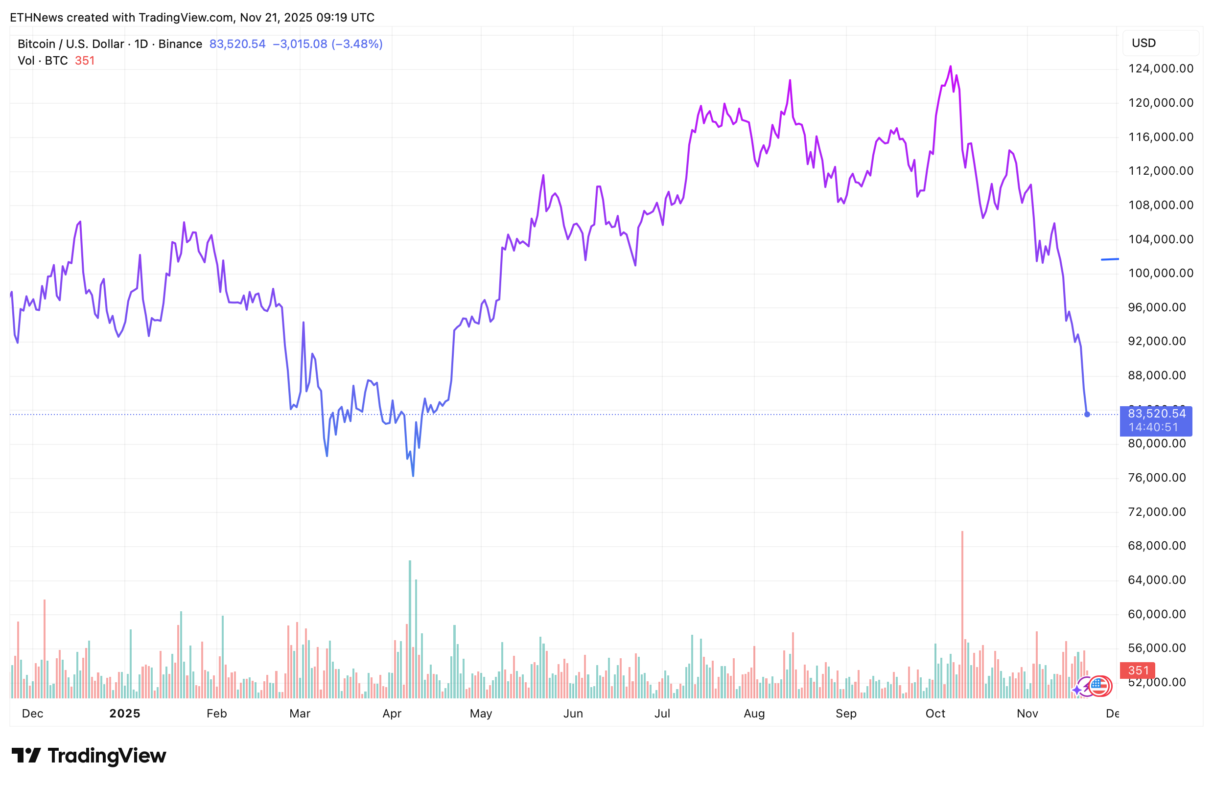 比特币的十一月下跌行情已演变为本年度最剧烈且最持久的回调之一,目前市价徘徊在83,000美元附近,下行趋势依然坚挺。此次延续了始于十月历史高点后的45天连跌,已吞噬比特币超30%市值。本次下跌的特殊性在于,分析师们逐渐形成共识:市场正在逼近"最大痛苦区间"——这一区域在历史上往往标志着投降式抛售与周期底部的形成。