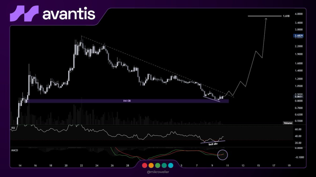 但包括@mikroweller在内的分析师认为,当前回调可能标志着关键转折点而非涨势终结。Mikroweller指出AVNT已触及强力支撑位,特别强调该代币近期回撤至0.618-0.786斐波那契区间——这通常是潜在反转区域。4小时图上RSI指标形成的底背离与MACD金叉,都是经典的见底信号。