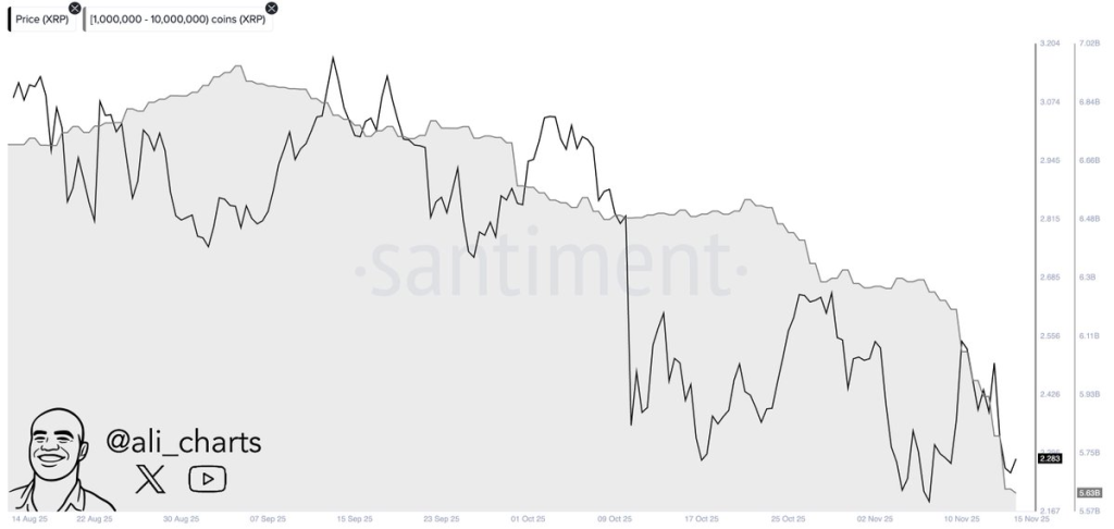 Santiment链上数据证实,持有100-1000万枚XRP的地址在48小时内减持2亿枚,总持仓从58.3亿枚降至56.3亿枚。这与价格下跌及交易所流入数据高度吻合。正如Ali Martinez所述:"鲸鱼在48小时内抛售近2亿枚XRP!