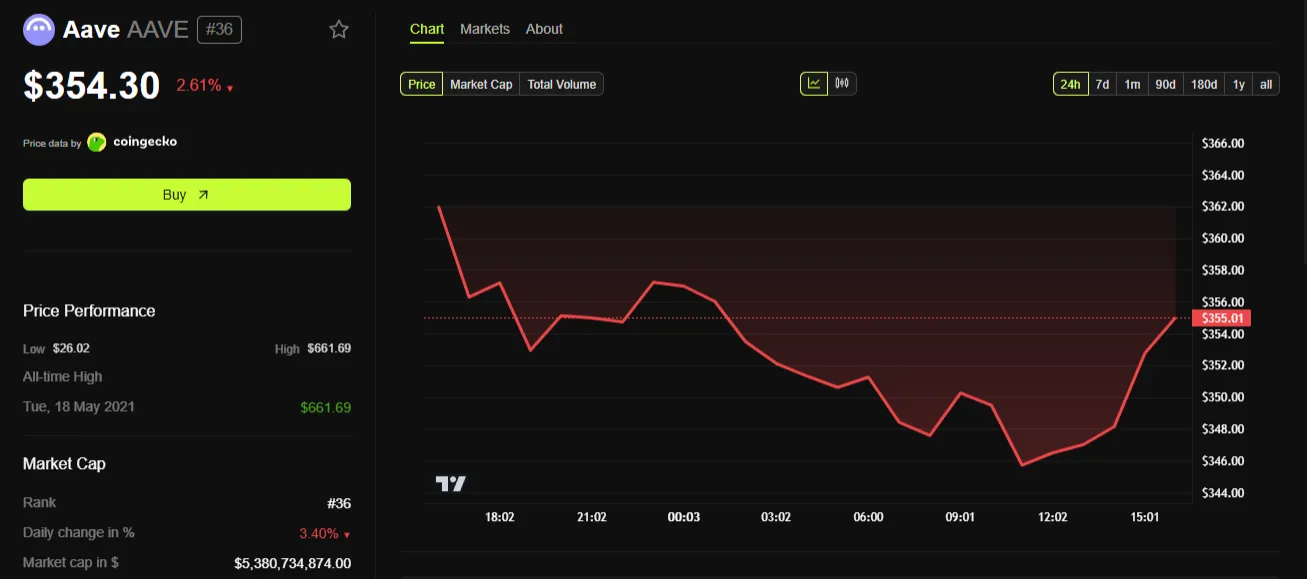 双方表态的明显矛盾导致加密市场出现波动。数据显示,争议发酵数小时后,AAVE价格下跌近2%,在343.63至367.73美元区间震荡后收于346.15美元。