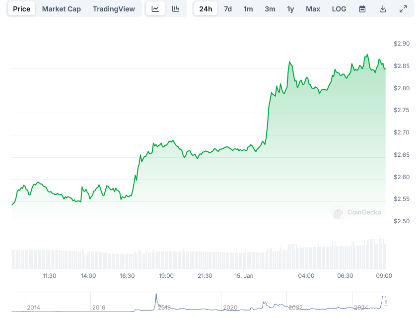 加密货币分析师指出,若要达到3.50美元的预期目标,还需要额外的43%涨幅。市场观察者正在密切关注几个关键阻力位,包括2.92美元和3.00美元。如果这些水平被突破,下一个主要阻力点可能会出现在3.120美元和3.200美元。