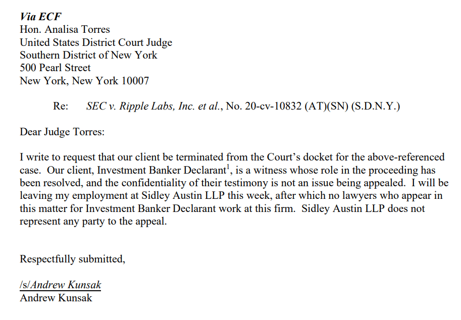 在最新提交的法庭文件中,盛德律师事务所的安德鲁·昆萨克请求托雷斯法官将其客户从法院日程中移除。昆萨克指出,作为本案核心证人的投资银行家宣誓人已完成其使命。"其证词的保密性不在上诉范围内",他补充道。