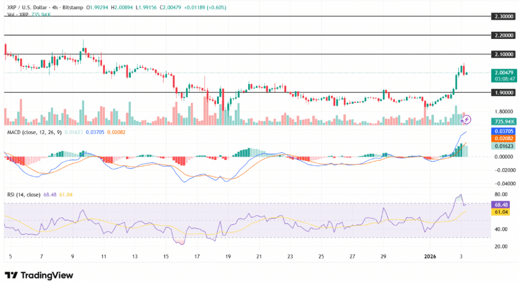 随着XRP在2.00美元上方企稳,市场关注点转向潜在的阻力位。最近的阻力位是2.10美元,若上行势头持续,随后将面临2.20美元和2.30美元。MACD指标仍处于看涨位置,MACD线持续位于信号线上方,为这一前景提供了支持。然而,相对强弱指数正接近68,表明市场在再次启动前可能经历短期盘整。