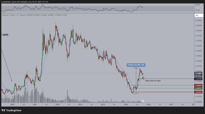 van de Poppe的分析图表显示,ETH/BTC在经历2022-2023年长期下跌后,已完成深度调整阶段。该交易对近期强势反弹44%,随后回落至他称为"理想买入区"的0.026-0.028 BTC关键支撑区域上方。