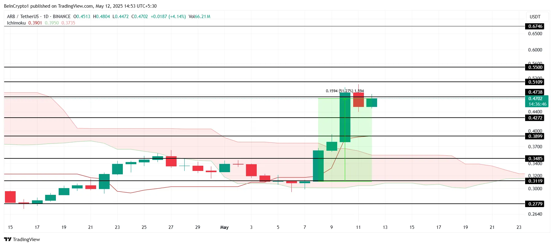 在代币解锁之前,ARB可能会进一步上涨。目前,一目均衡表位于蜡烛图下方,显示出潜在的看涨势头。如果这种势头持续,ARB可能突破0.51美元,向0.55美元迈进,强劲的买盘支撑可能在短期内推动该代币走高。