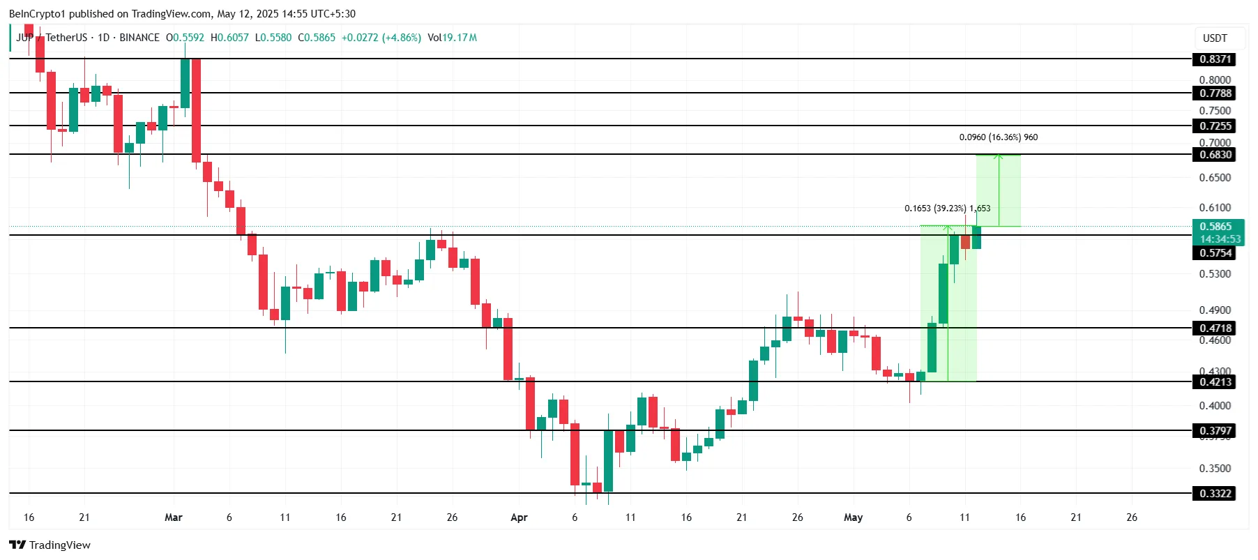 JUP在过去几天内上涨近40%,目前交易价格为0.58美元。要达到0.68美元的关键阻力位,该代币还需要16%的上涨。当前势头显示出潜力,但需要将0.57美元作为支撑位才能进一步上涨。