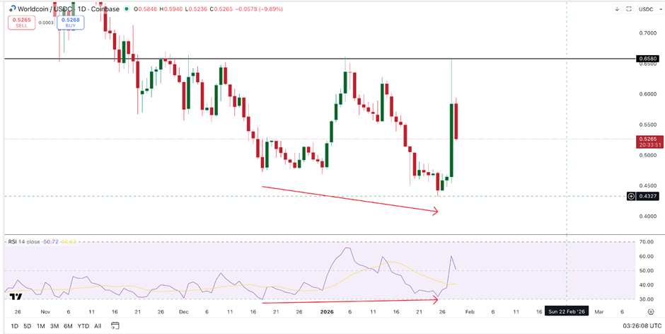 近期的反弹并非凭空出现。在12月18日至1月25日期间,Worldcoin价格创下了更低的低点。然而在同一时期,作为动量指标的RSI却形成了更高的低点。这是一种看涨背离,通常出现在抛压开始消退时,往往是趋势反转的信号。