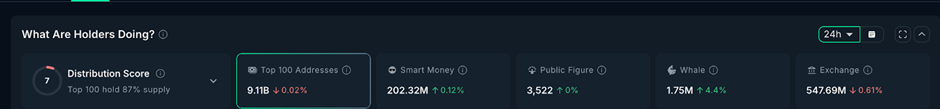 虽然散户似乎在抛售,但大额持有者的行为却截然不同。数据显示,在此期间Worldcoin鲸鱼地址的持仓增加了约4.4%,这一动向值得关注。
