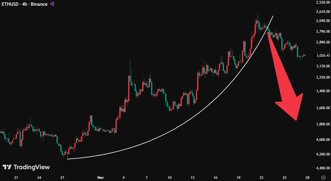以太坊近期涨势在10月下旬至11月中旬形成了一条陡峭的抛物线轨迹。该结构通过持续收窄的回调和更强力的反弹推动价格上涨,昭示着动量驱动下的强势上升阶段。分析师Cas Abbé发布的图表指出ETH“已跌破抛物线轨迹”,标志着曲线支撑失效的关键节点。价格在触及2900美元上方区域后掉头下行,未能回归原有轨迹。这一转变代表着结构性转变而非单纯的技术回调。