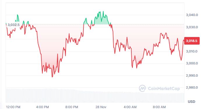 截至撰稿时,以太坊最新交易价位于3017美元附近。日内走势显示价格在2995-3035美元区间反复震荡。反弹缺乏延续性,下探过程中心理关口屡受考验却无强力支撑。这种平衡状态显示出市场不确定性而非趋势延续。