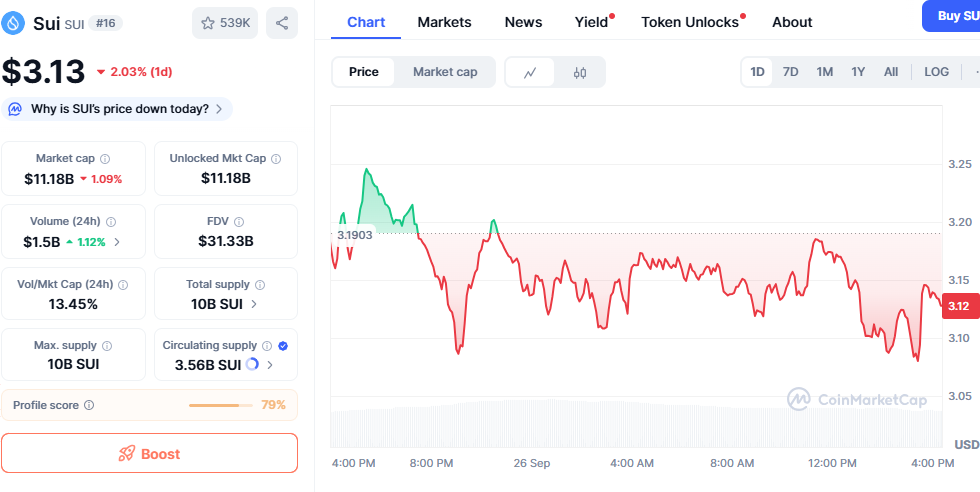 SUI现报3.13美元,24小时跌幅2.03%。尽管价格下跌,日交易量却攀升至15亿美元,表明市场对该代币的需求保持稳定,参与度持续活跃。