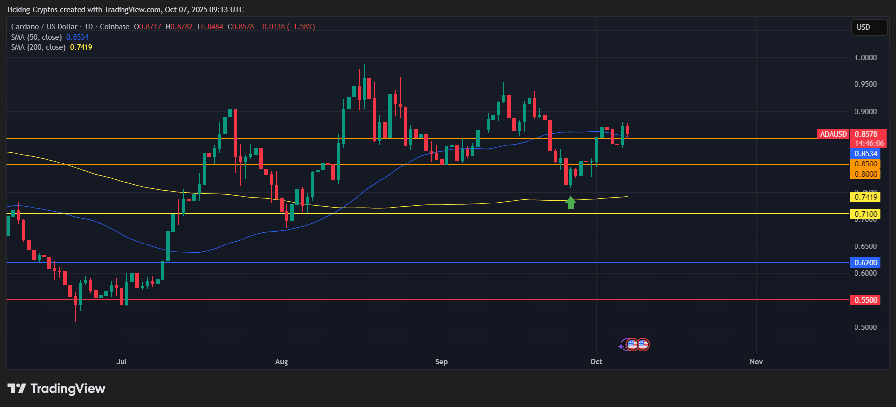 比特币飙升至126,000美元以上的历史新高,山寨币纷纷跟进。卡尔达诺($ADA)在短暂回调后从0.85美元支撑区域反弹,该支撑位与50日简单移动平均线(SMA)0.853美元高度重合,表明强劲的买盘兴趣。