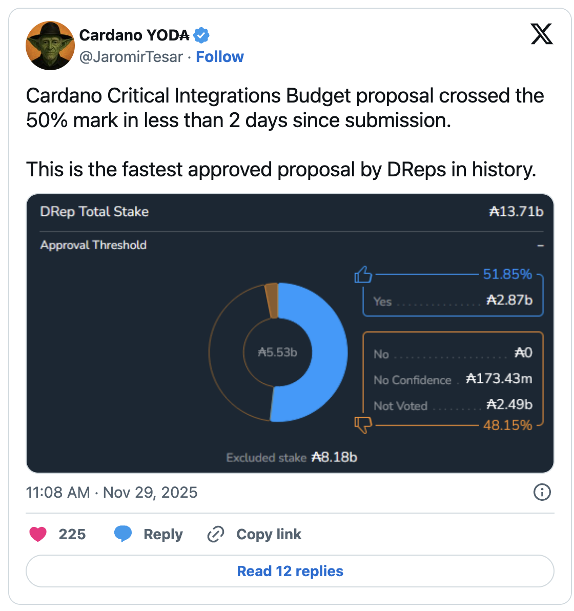 在卡尔达诺发展历程中,其去中心化治理迎来重要突破。一项由DReps提交的预算提案在不到两天内获得超过50%的赞成票,创下平台历史最快通过纪录。这项名为“卡尔达诺关键集成预算”的提案计划从国库基金中拨付7000万ADA用于关键生态集成,充分彰显了卡尔达诺治理体系的成熟度与社区高效决策能力。
