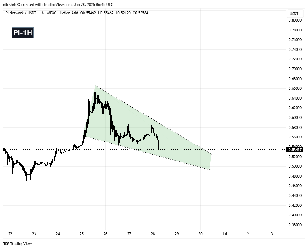 尽管长期基本面持续增强,但短期图表显示需保持谨慎。在1小时图表中,PI目前呈现下降楔形形态——这种结构通常预示看涨反转。当前价格维持在0.52美元附近的支撑趋势线上方,该位置可能成为潜在反弹区。