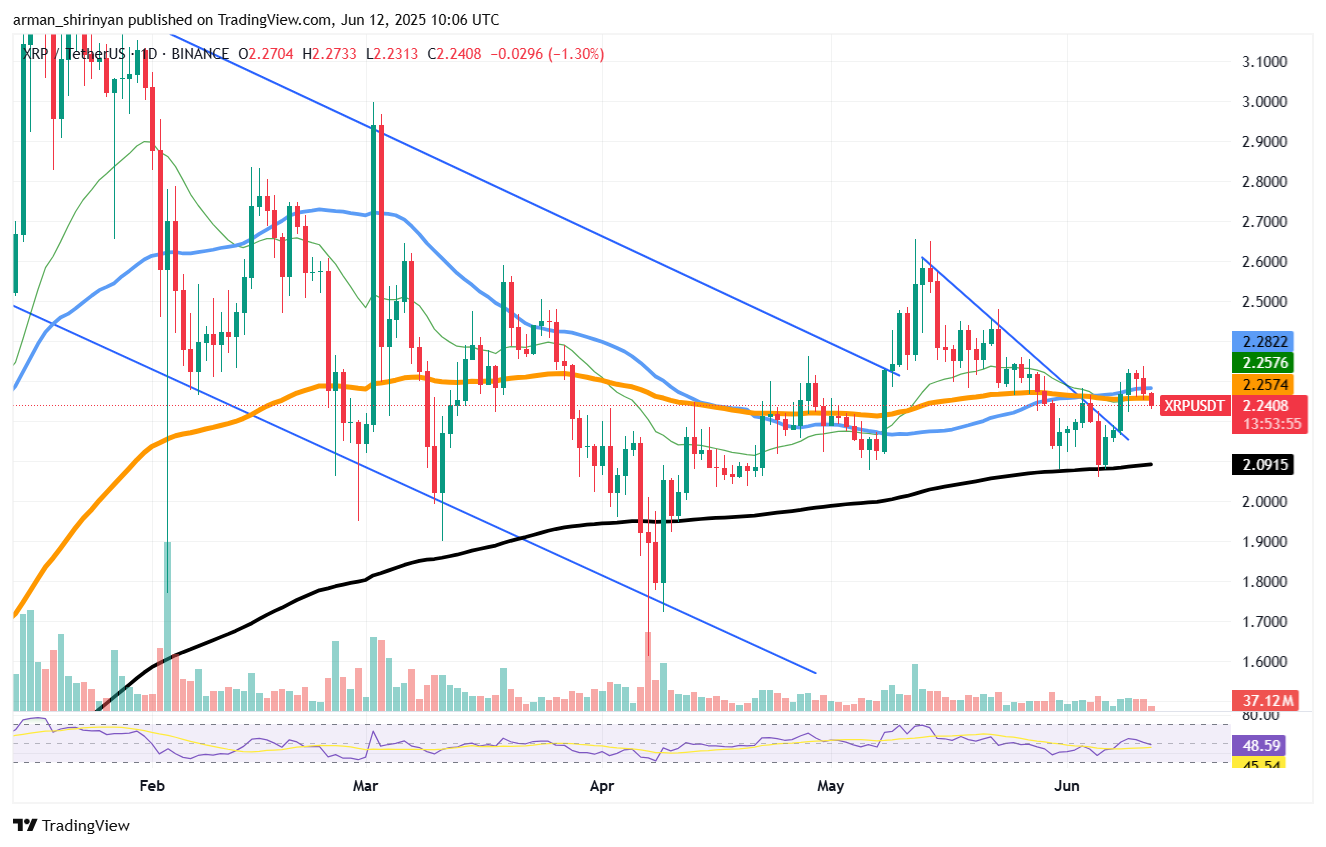 XRP当前交易价格为2.24美元,较前一日下跌超1%,反弹势头正在减弱。尽管XRP仍位于2.09美元的200日均线之上,但未能站稳50日和100日均线(2.25美元)的关键事实表明,看涨交叉可能无法完整形成。缺乏明显的买盘量能支撑下,价格或将持续在这些水平间震荡,导致均线走平甚至反转,使黄金交叉确认失败。