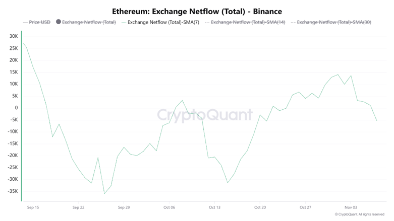 11月5日CryptoQuant数据显示,ERC20稳定币7日净流动均线突破6.4亿美元,主要流入币安交易所。同时观察到约5355枚ETH的净提现,表明稳定币正被用于吸筹并转入自托管钱包。