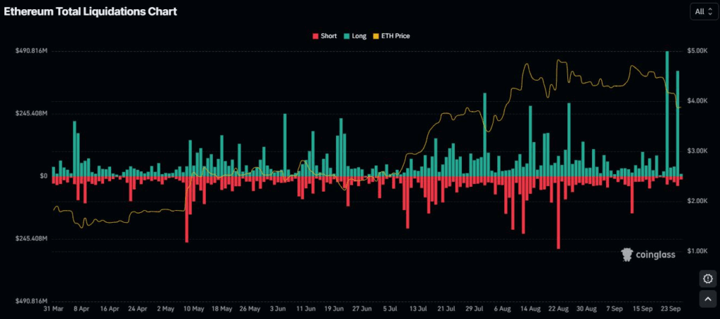 值得注意的是,这已成为过去六个月中第二高的单日多头清算事件。而本周最高清算日出现在9月22日,当日清算多头头寸飙升至4.9亿美元以上。综合来看,仅本周ETH多头清算总额已突破10亿美元大关。