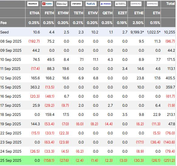 巨额现货资金外流,特别是来自巨鲸和机构的资金撤离,成为影响ETH本周表现的核心因素。Coinglass现货流量数据显示,自9月中旬以来该加密资产持续呈现显著资金外流。