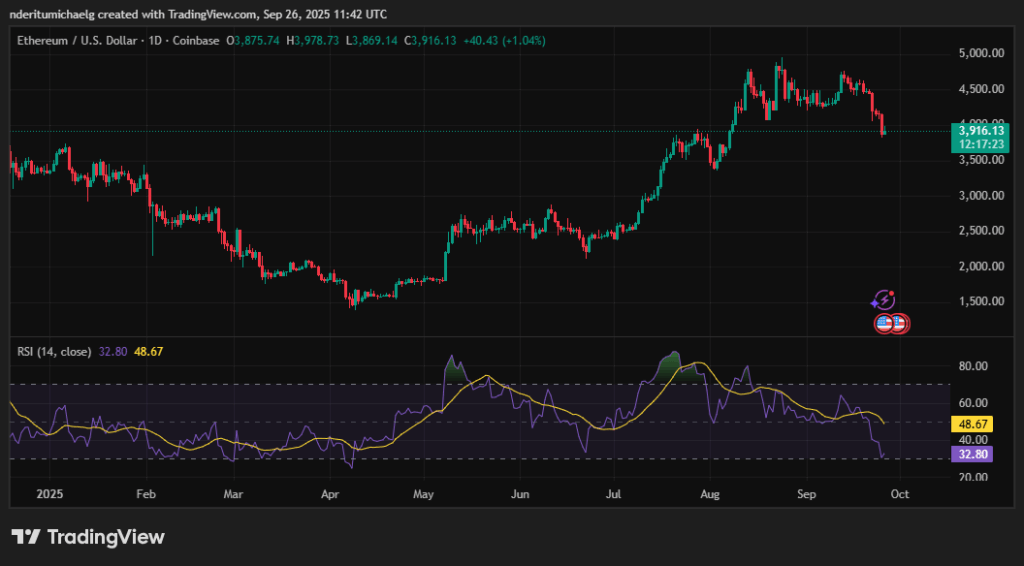 截至发稿时,以太坊价格徘徊在3909美元附近,由于市场恐慌情绪蔓延,看跌投降效应引发大规模回调。数据显示,自本周初以来ETH价格已回落约12%。
